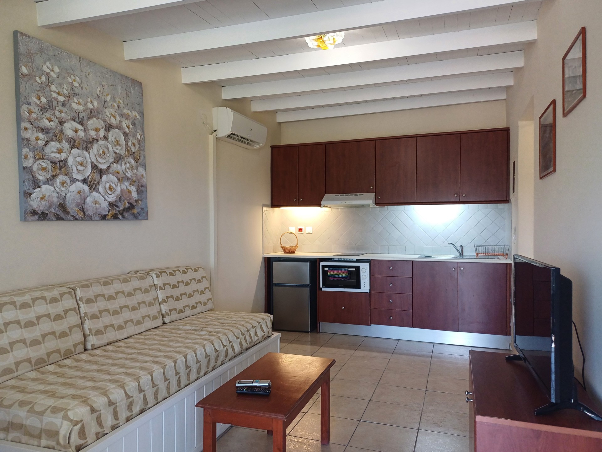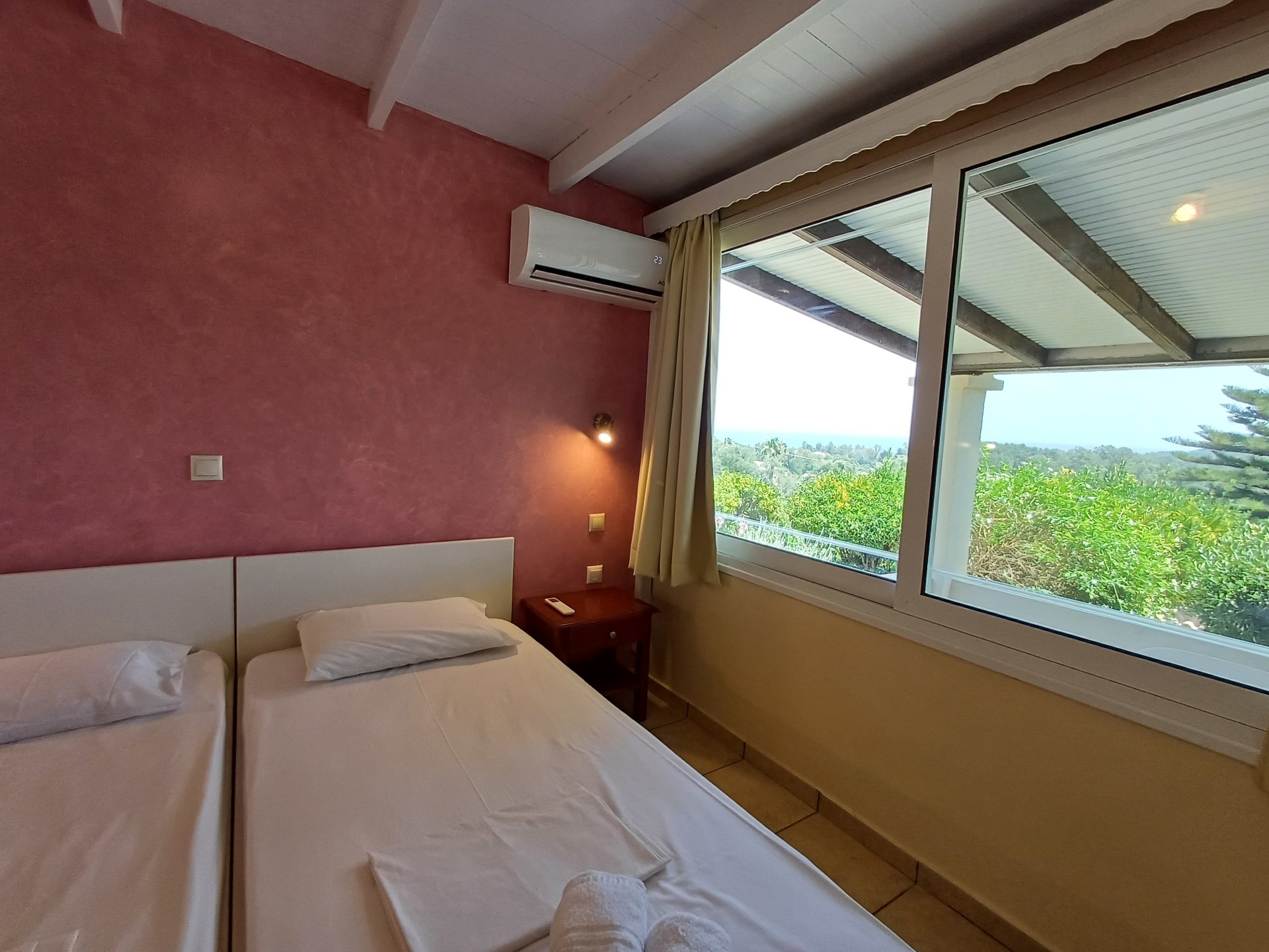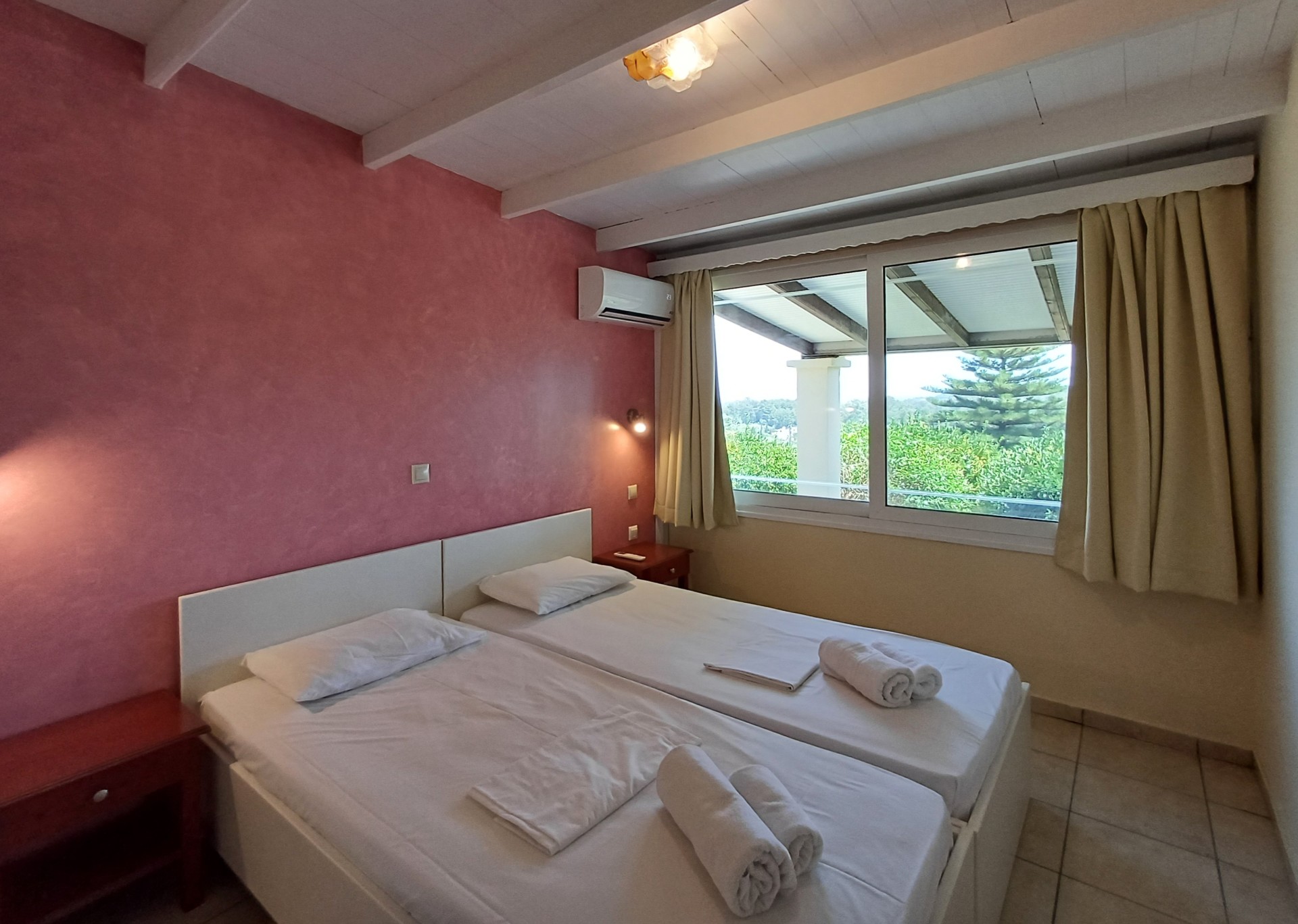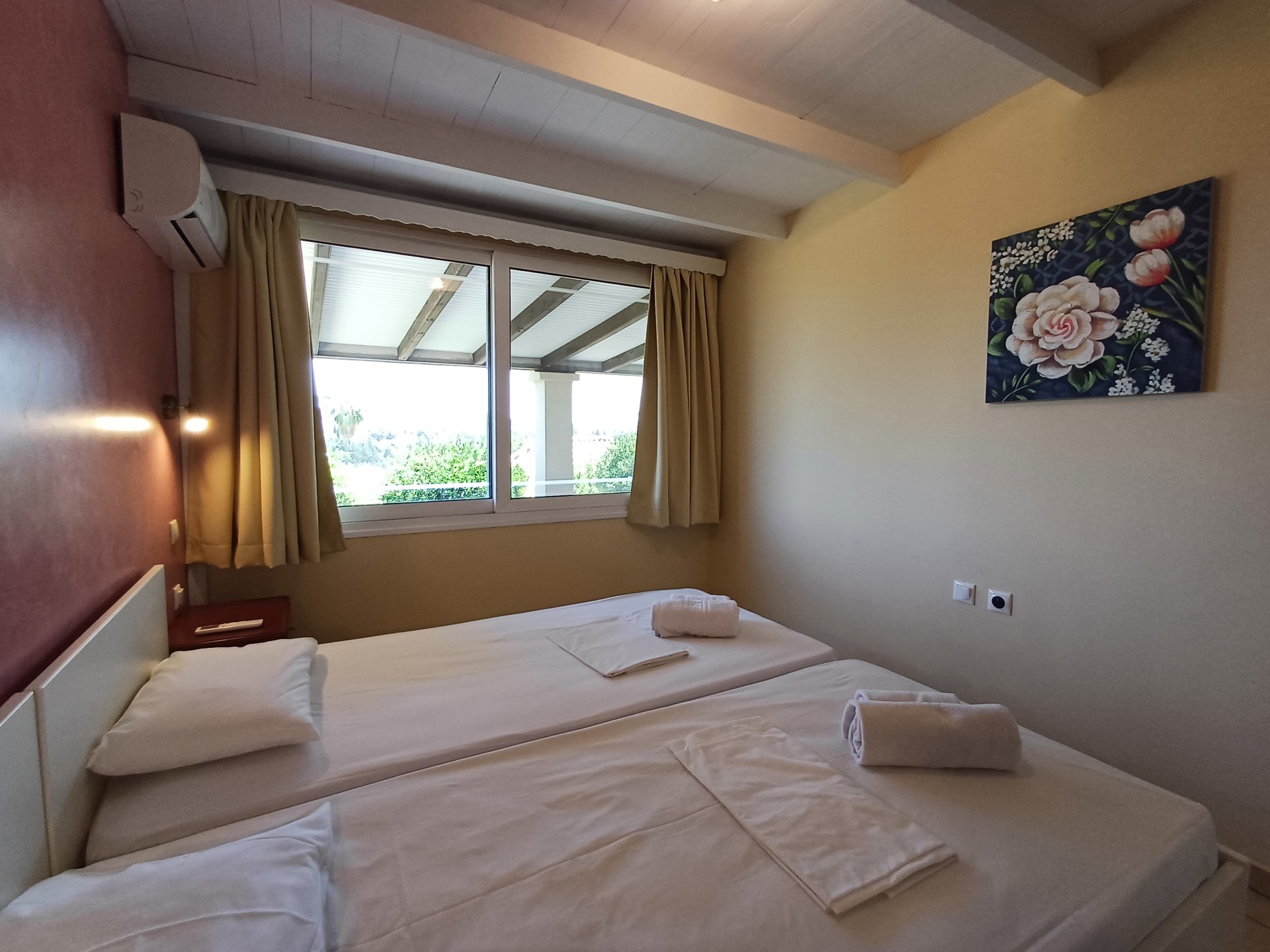 Τα Superior Two-bedroom διαμερίσματά μας μπορούν να φιλοξενήσουω έως και πέντε επισκέπτες. Βρίσκεται στο ισόγειο, με άμεση πρόσβαση στον κήπο. Δύο κρεβάτια βρίσκονται στο ένα υπνοδωμάτιο, άλλα δύο κρεβάτια βρίσκονται στο δεύτερο υπνοδωμάτιο και έχουν ένας ή δύο καναπέδες-κρεβάτια στο σαλόνι. Είναι πολύ ευρύχωρο, περίπου 55 τ.μ. Έχει υπέροχη θέα στη θάλασσα από τη βεράντα, τα υπνοδωμάτια και το σαλόνι. Η κουζίνα είναι εξοπλισμένη με επαγωγική εστία, φουρνάκι και μικρό ψυγείο με καταψύκτη. Η βεράντες είναι εξοπλισμένες με άνετα έπιπλα εξωτερικού χώρου.