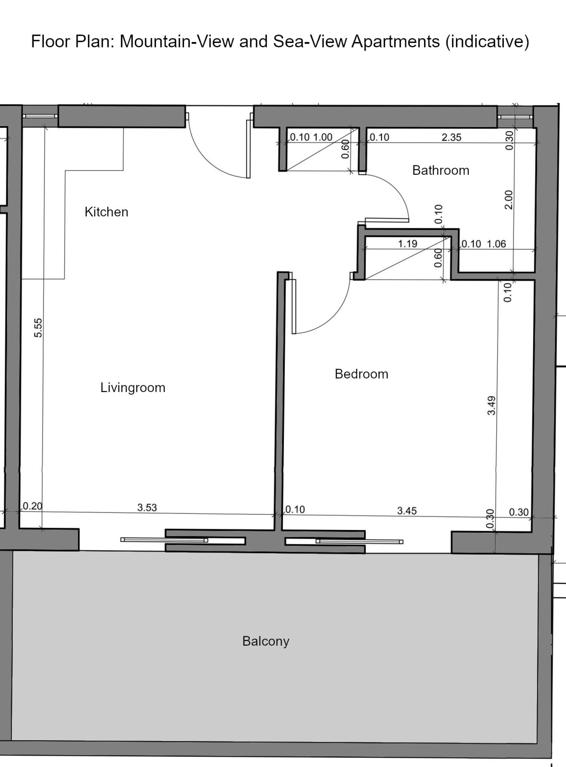 Our Mountain View apartments sleep up to four guests. Two beds are in the bedroom and two sofa-beds in the living room. The rooms are spacious at about 42 sq. meters (452 sq, ft.). They have large balconies with views overlooking distant mountains and Gouvia Marina. The sliding windows lead to the balcony. Awnings and shutters offer shade when you need it.